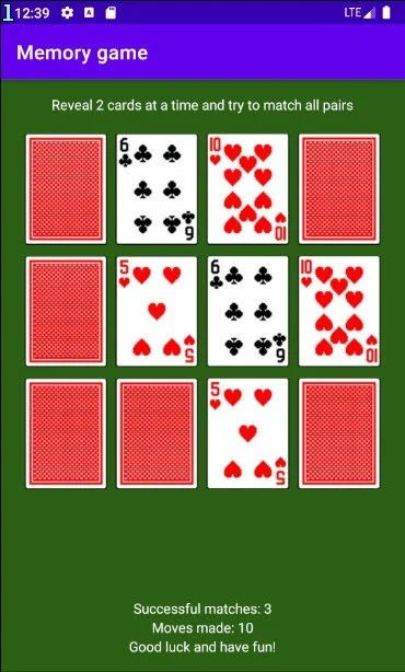 This program is a basic memory game for the Android operating system, where the player is tasked with finding the matches amongst a group of face-down cards. The program keeps track of the number of attempts needed as well as the number of successful matches.